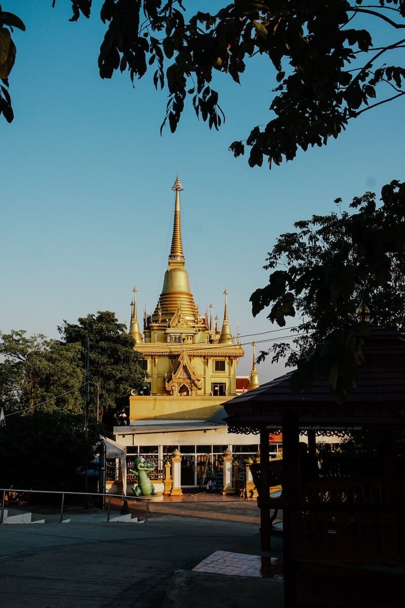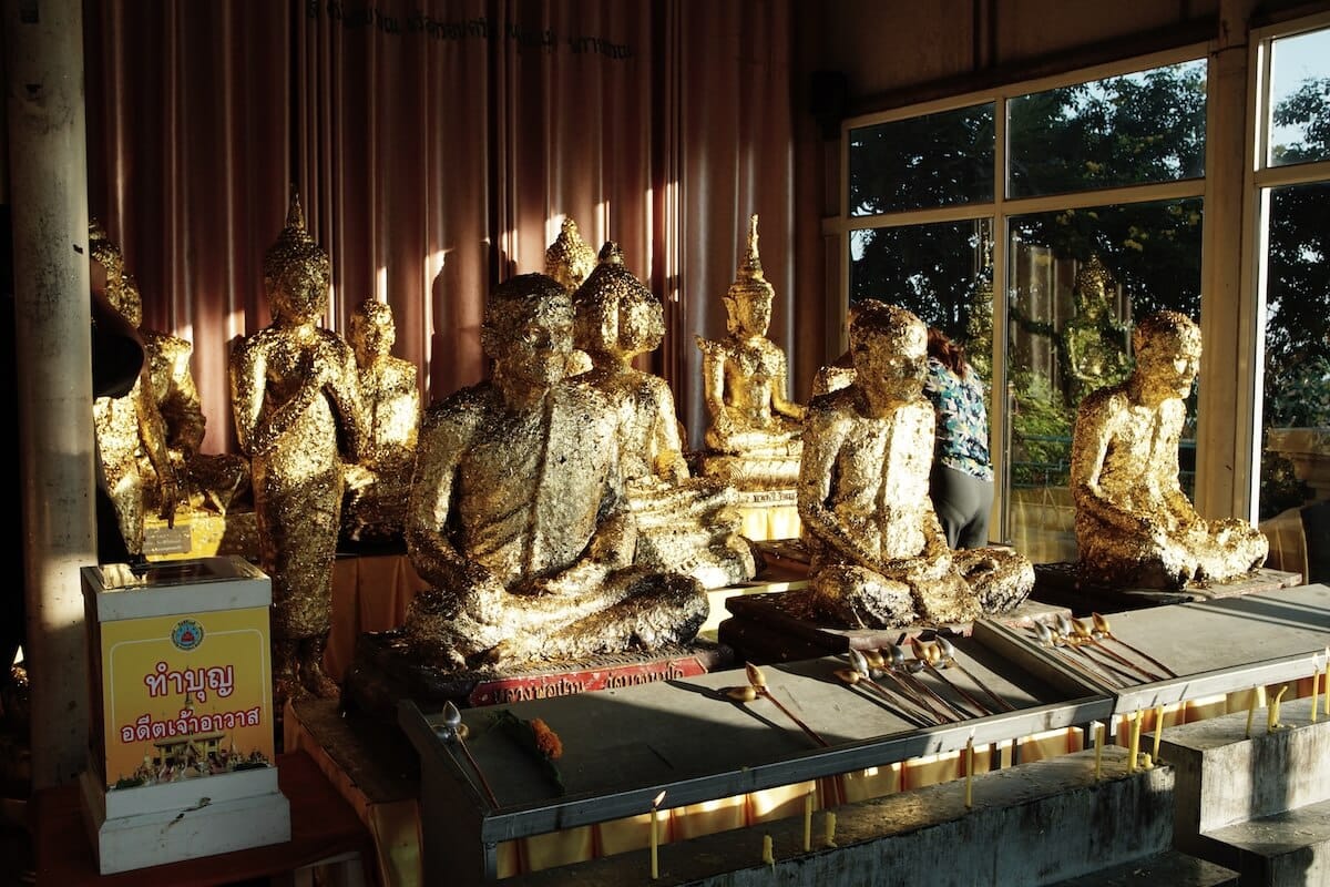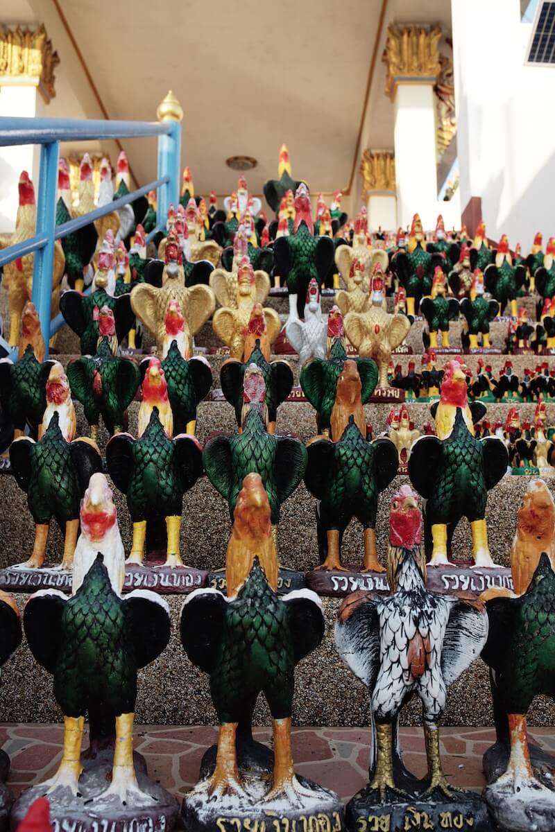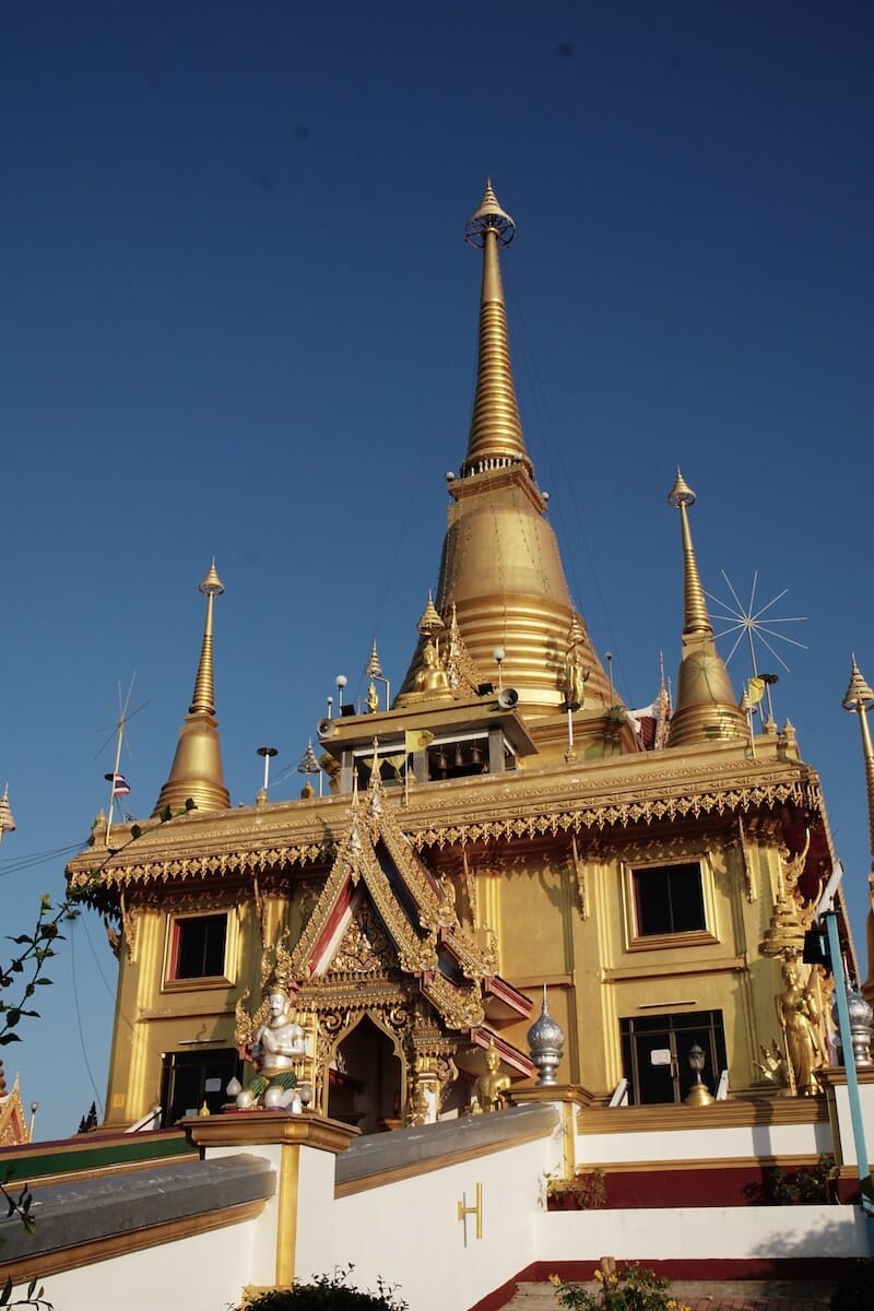 The temple complex is spacious and beautifully decorated in gold, with multiple statues and interesting elements scattered around. There’s an observation tower you can climb, areas where people donate chicken statues as offerings, and another statue where visitors paste gold leaves onto its surface.