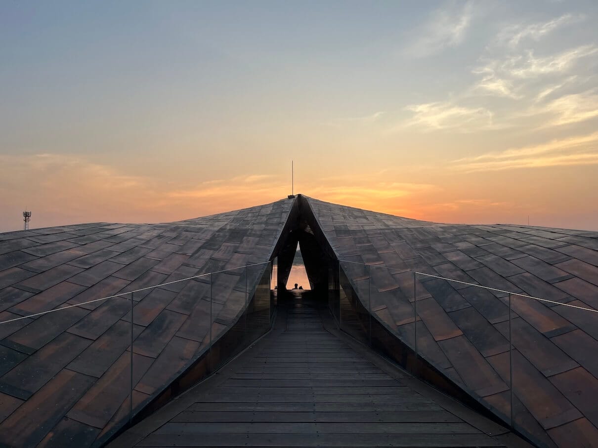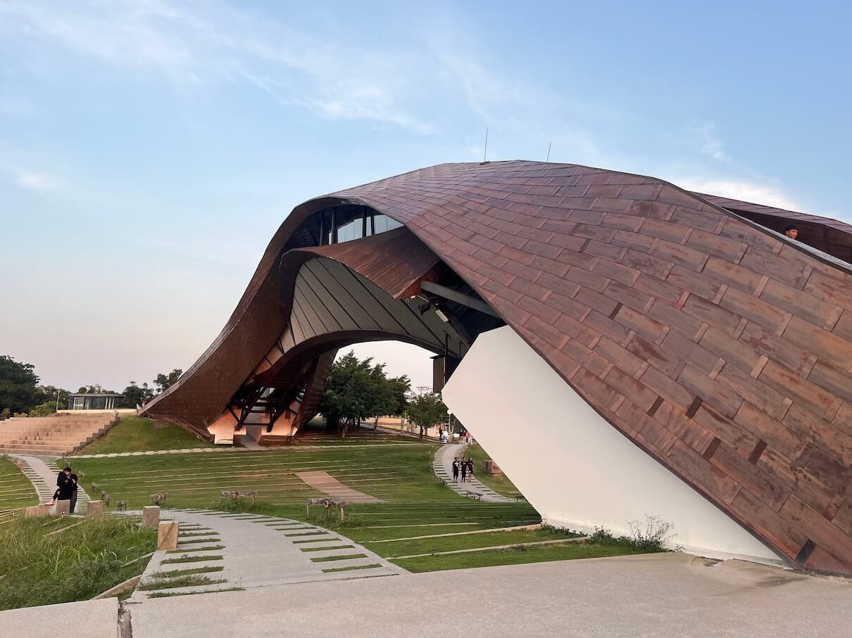 As you walk towards the river, there are small stalls selling drinks and snacks. The architecture here is striking, designed to show how the 4 rivers converge. You can walk up onto a bridge to overlook the water.