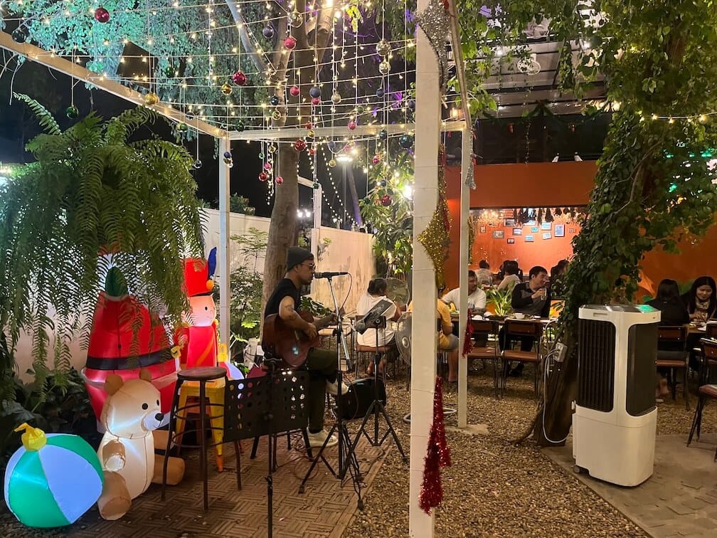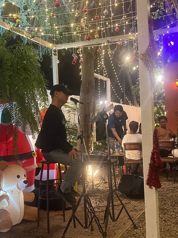 We sat outdoors, where there was live music with rotating singers. Some sang Thai songs, some sang English oldies like The Beatles.